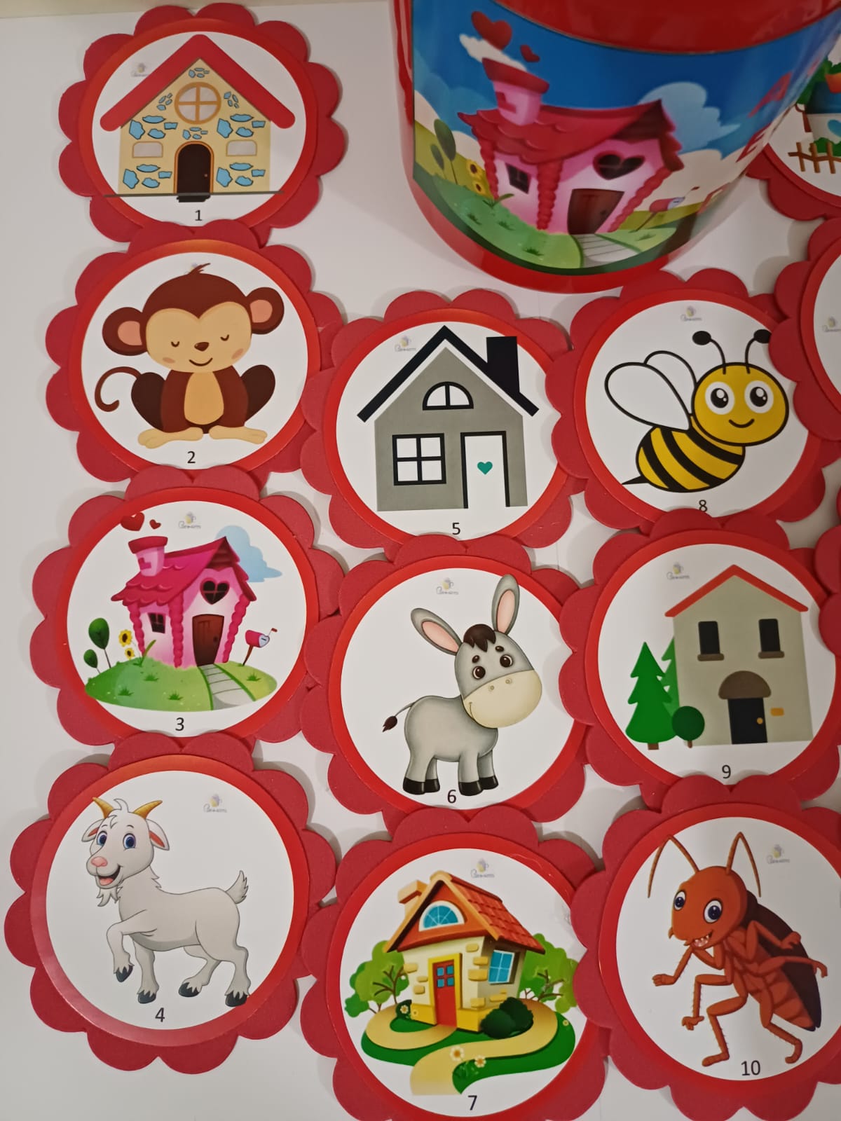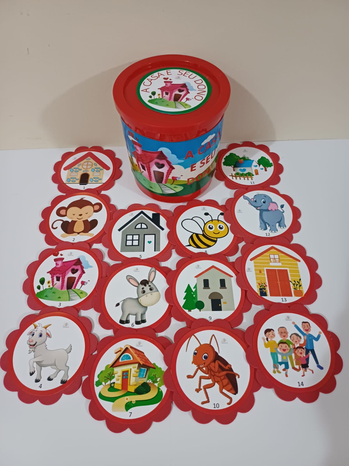Descrição: O arquivo Poema na Lata “A casa e seu dono” contém 21 fichas, sendo 14 com ilustrações: 7 fichas com as casinhas; 7 fichas com os animais que nela vivem. E 7 fichas com o poema escrito. Esse poema usa rimas e repetição de palavras de forma cativante, o que auxilia no desenvolvimento da consciência fonológica e na identificação de sons iniciais, além de desenvolver a linguagem, criatividade e alfabetização, estimulando o raciocínio lógico.