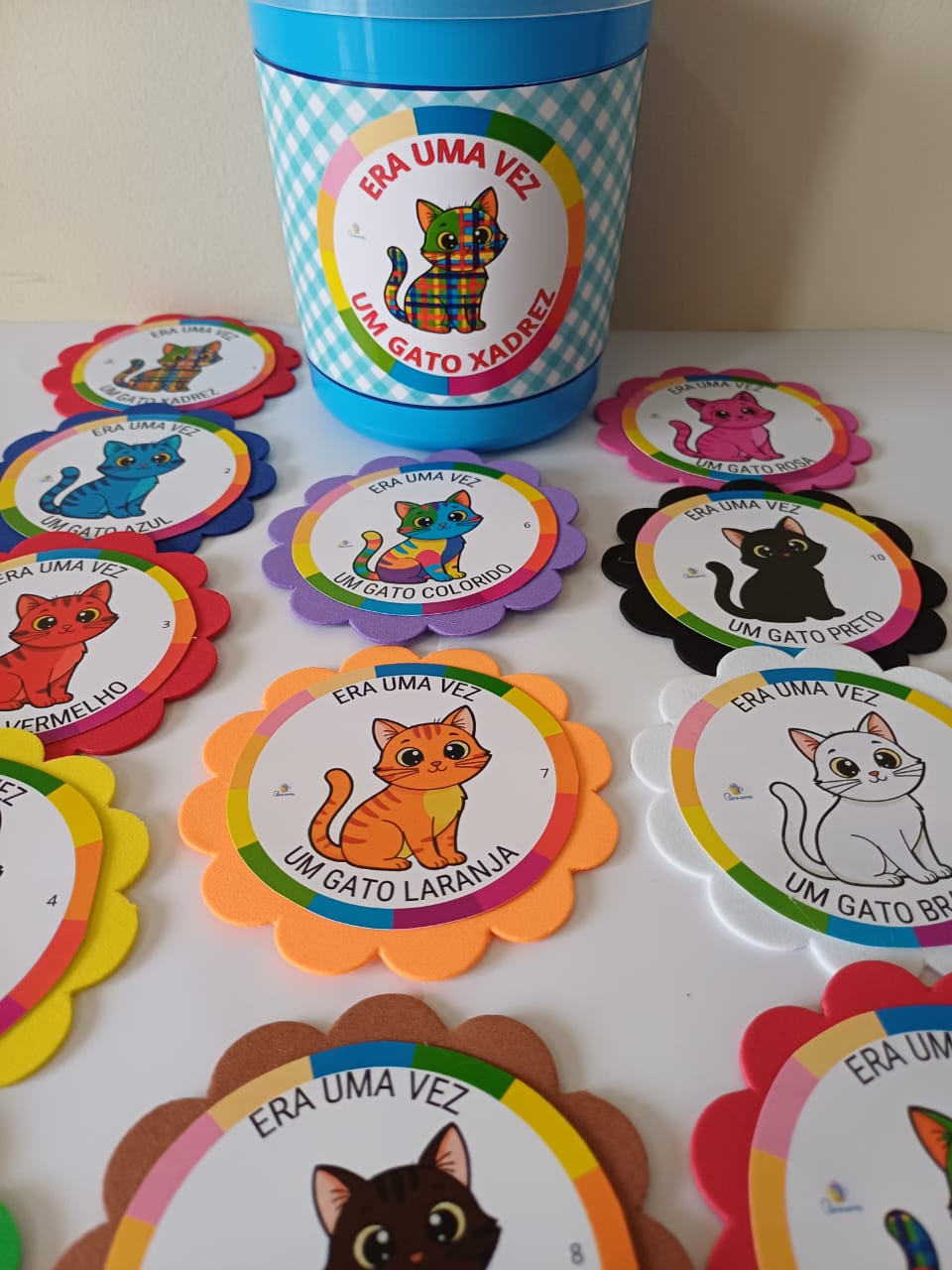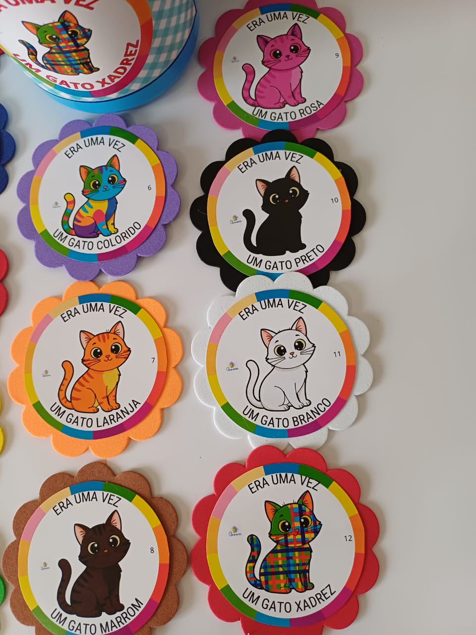 Descrição: Arquivo Poema na Lata: “Era uma vez um gato xadrez” Contém 24 fichas no total, sendo 12 fichas com as ilustrações dos gatos coloridos e 12 fichas com as ilustrações do que acontecem com eles.